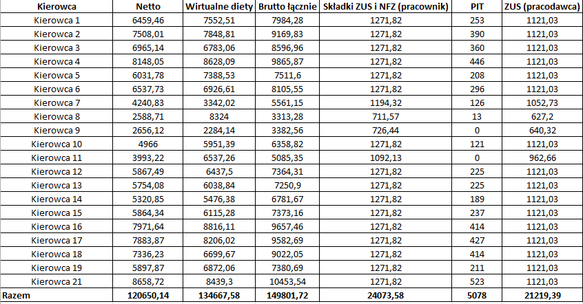 Wariant 2 – przedsiębiorca optymalizuje płace kierowców pod kątem faktycznie wypłaconych wynagrodzeń